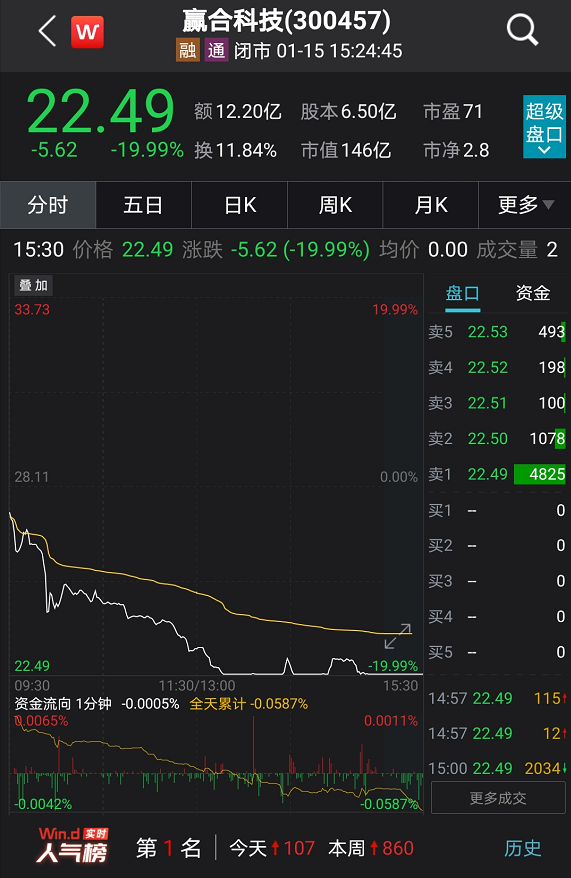 股民们的哀怨和质疑,并非空穴来风。1月15日,赢合科技以27.20元/股低开,此后便一路下挫,午盘后不久即走向跌停。当日报收22.49元/股,跌幅19.99%。当日成交总量51.38万手,成交总额12.20亿元,换手率高达11.84%,振幅17.79%。