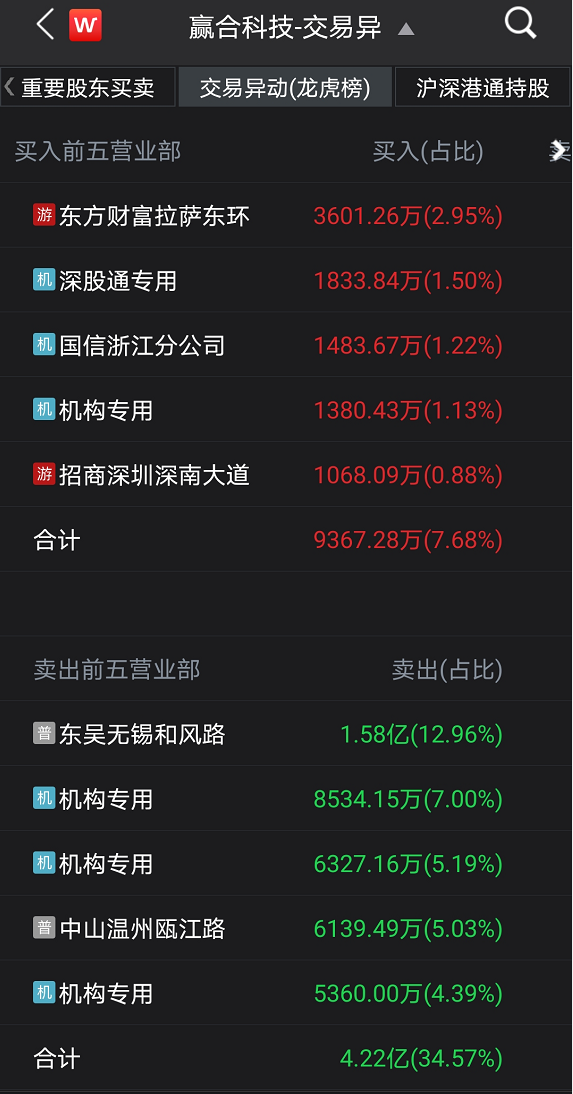 当日盘后,赢合科技因属于有价格涨跌幅限制的日收盘价格跌幅达到15%的前五只证券,登上龙虎榜。当日,共有4个机构席位出现在赢合科技的龙虎榜单之上,分别位列买四、卖二、卖三、卖五,合计净卖出1.88亿元,占龙虎榜净卖额的55.49%,是当日龙虎榜中遭机构净卖出最多的个股。
