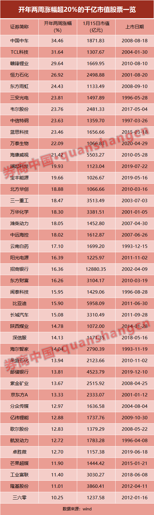 开年以来,有2只千亿市值个股区间涨幅超过30%,分别为中国中车(34.46%)、TCL科技(31.64%),赣锋锂业、恒力石化、东方雨虹、三安光电、韦尔股份、中信特钢、蓝思科技、万泰生物、海康威视等个股区间涨幅超过20%。
