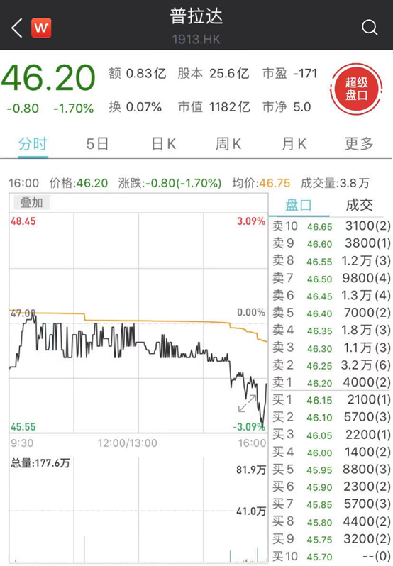 18日尾盘,Prada股价突然跳水,一度跌超3%,随后跌幅收窄,截至收盘,跌1.7%,报46.20港元/股。