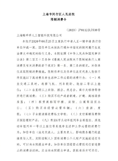 2020年9月,郑爽前男友,上海鲸乖乖人工智能科技有限公司法定代表人、执行董事张恒收到限制消费令,发布法院为上海市闵行区人民法院,案号为(2020)沪0112执7538号。