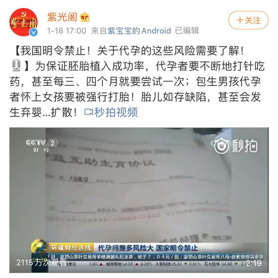 18日下午,紫光阁、共青团中央发布微博称:“我国明令禁止代孕,关于代孕的这些风险需要了解!”文章指出,为保证胚胎植入成功率,代孕者要不断地打针吃药,甚至每三、四个月就要尝试一次;包生男孩代孕者怀上女孩要被强行打胎!胎儿如存缺陷,甚至会发生弃婴…扩散!
