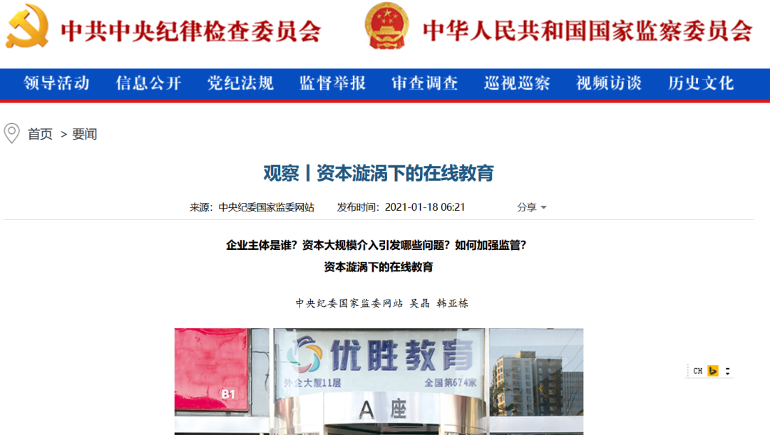 1月18日,中央纪委国家监委网站发布文章直指风口浪尖上的在线教育乱象与监管问题。
