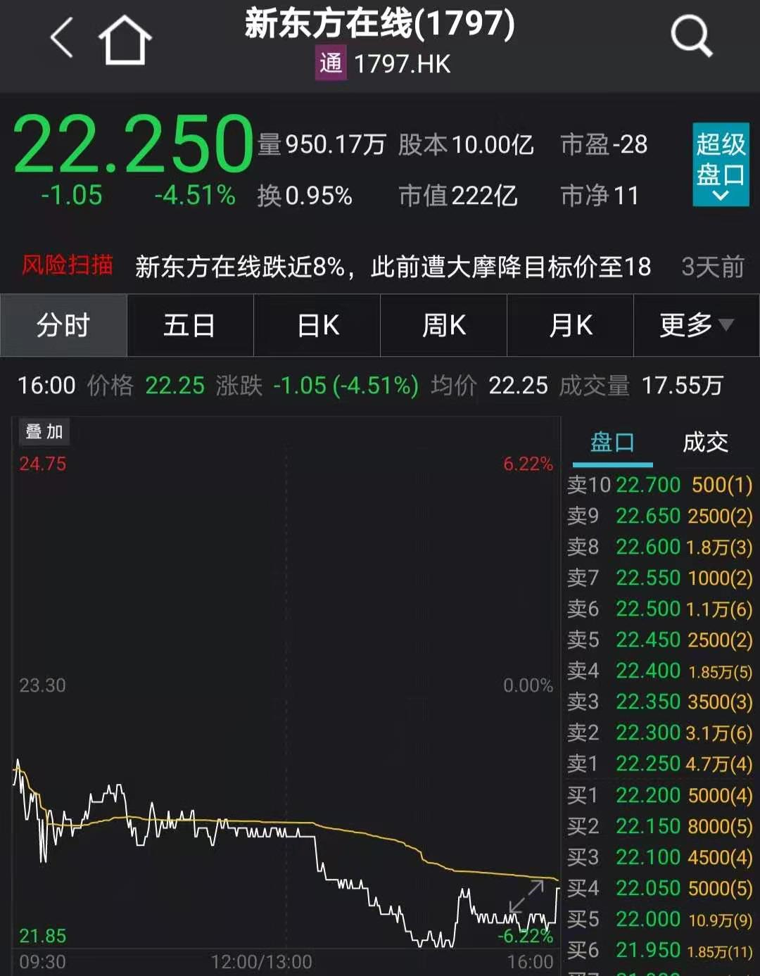 港股方面,新东方在线午后跌势不止,一度跌超6%,截止收盘,下跌4.5%。