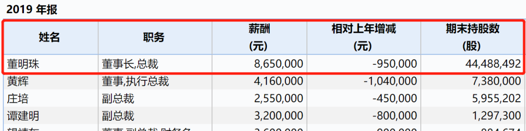 这和格力的股价也离不开关系。数据显示,董明珠2019年薪酬865万,持有格力电器股数4448.8万股。