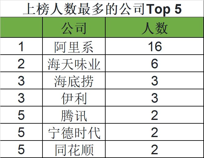来自24家企业。有7家企业都有不止一位职业经理人上榜。上榜人数最多的是阿里系,其次是海天味业、海底捞和伊利等。