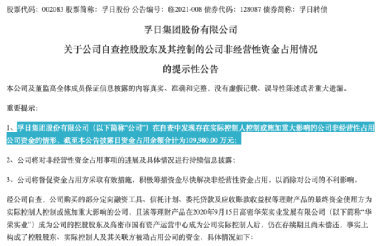 1月19日晚间,孚日股份发布公告称,在自查中发现存在实际控制人控制或施加重大影响的公司非经营性占用公司资金的情形,截至本公告披露日资金占 用余额合计为109,980.00 万元。
