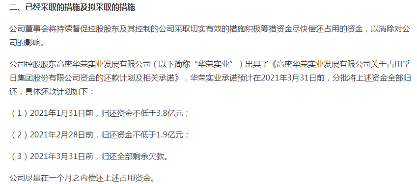 公司控股股东高密华荣实业发展有限公司(以下简称“华荣实业”)出具了《高密华荣实业发展有限公司关于占用孚日集团股份有限公司资金的还款计划及相关承诺》,华荣实业承诺预计在2021年3月31日前,分批将上述资金全部归还,具体还款计划如下: