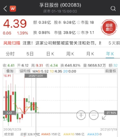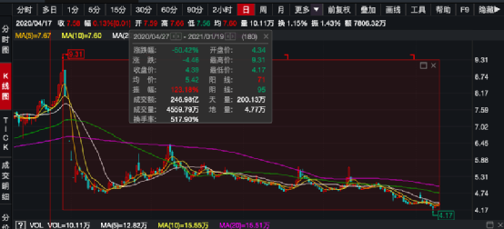 由于频繁被监管关注和处罚,去年4月底开始,公司股价闪崩,连续5个跌停后跌势不止。截至1月19日收盘,其股价已从9.31元高点下跌超50%,遭遇腰斩。