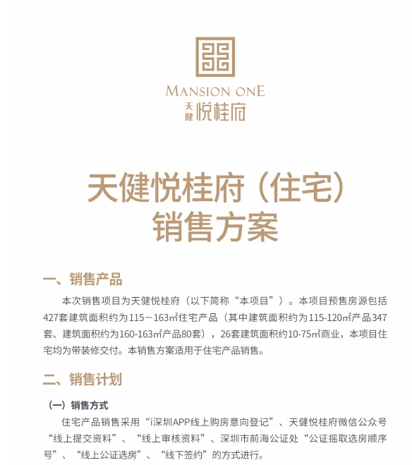 1月19日,天健悦桂府和天境前海花园先后发布了住宅销售方案。本次采用线上公证选房的方式,还是无房者优先,认筹金都是300万。因为两个项目都是大户型,总价至少1000万起。