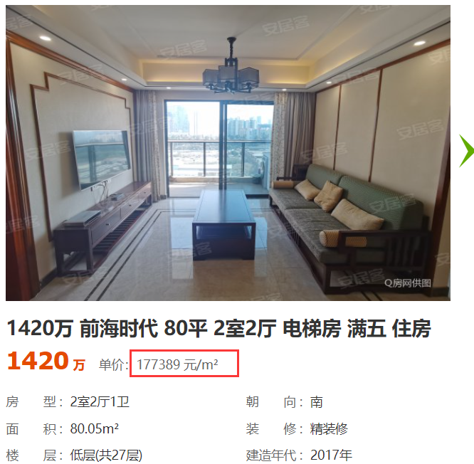 而目前,同样位于前海片区的前海时代小区,挂牌价高达每平方米17至20万元之间。