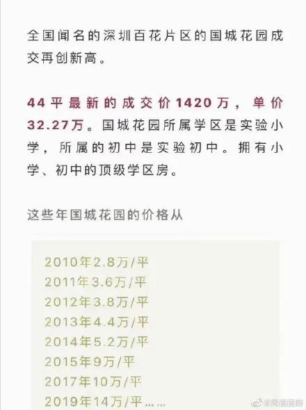 上周末,《证券时报》报道称,有消息称深圳福田百花片区的国城花园,44平方米房源成交价格达到1420万元,折合每平方米32.27万元。由于该小区自带深圳实验小学和实验中学两个优质学位,多年来,备受家长和投资客追捧。链家APP显示,该小区建成年代1995至1998年,楼龄已超过20年。