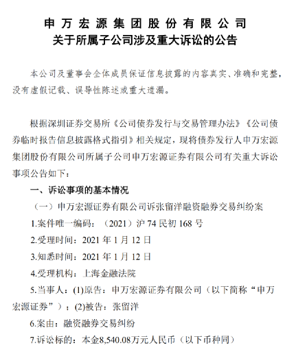 1月20日,龙头上市券商申万宏源披露一则重大诉讼公告,债券发行人申万宏源集团股份有限公司所属子公司申万宏源证券就两起融资融券交易纠纷提起诉讼,引发业内关注。