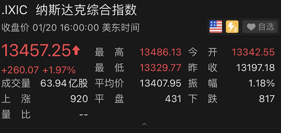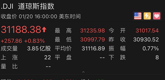 截至收盘,道指涨0.83%报31188.38点,标普500指数涨1.39%报3851.85点,纳指涨1.97%报13457.25点。