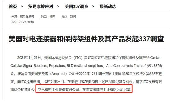 随后,商务部网站发布美国际贸易委员会关于对特定电连接器和保持架组件及其产品发起337调查的决定,立迅精密涉案其中。
