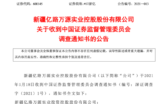 1月26日,*ST新亿公告表示,公司于2021年1月18日收到中国证券监督管理委员会调查通知书,因涉嫌信息披露违法违规,根据《中华人民共和国证券法》等有关规定,证监会决定对公司立案调查。
