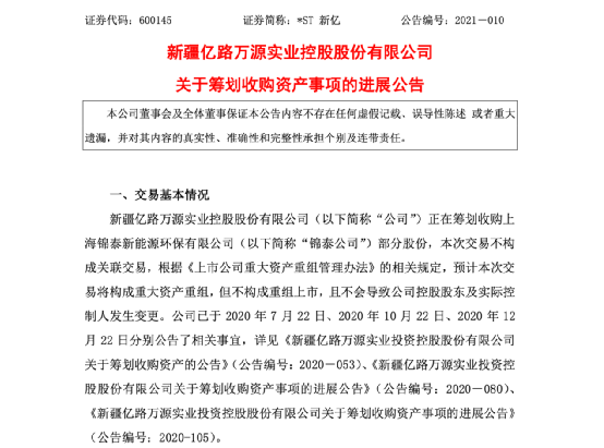 据了解,*ST新亿正在筹划收购上海锦泰新能源环保有限公司部分股份,并载1月26日再次披露相关进展。*ST新亿指出,预计本次交易将构成重大资产重组,但不构成重组上市,且不会导致公司控股股东及实际控制人发生变更。