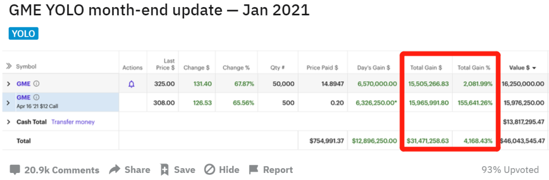 记者在reddit上看到,Gill在WSB论坛贴出最新业绩截图显示,一月,他投资GME股票和期权的合计收益超过3147万美元(超2亿元人民币),总收益率超过4168%。