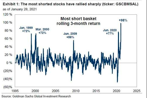 在过去三个月里,美股一篮子被最严重做空的股票上涨了98%,超过了2000年和2009年轧空中的上涨幅度,当时这篮子股票分别上涨了72%和56%。
