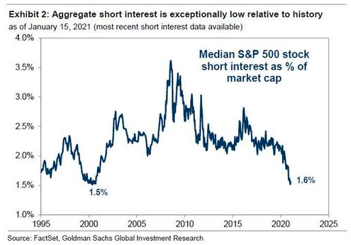 不过目前美股的整体做空比例处于历史较低水平。今年年初,标普500指数成份股的空头比例中值仅相当于市值的1.5%,与2000年中期的水平相当,至少是过去25年来的最低水平。