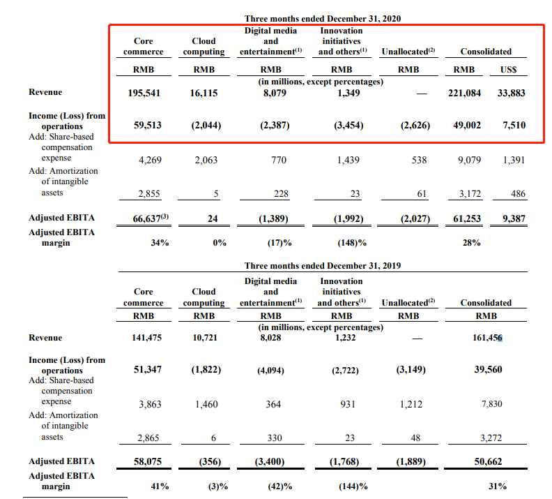 2020年,中国新型基础设施建设加快。财报显示,阿里云营收强劲增长至人民币161.15亿元,经调整EBITA转正,保持了同比50%以上的增长。