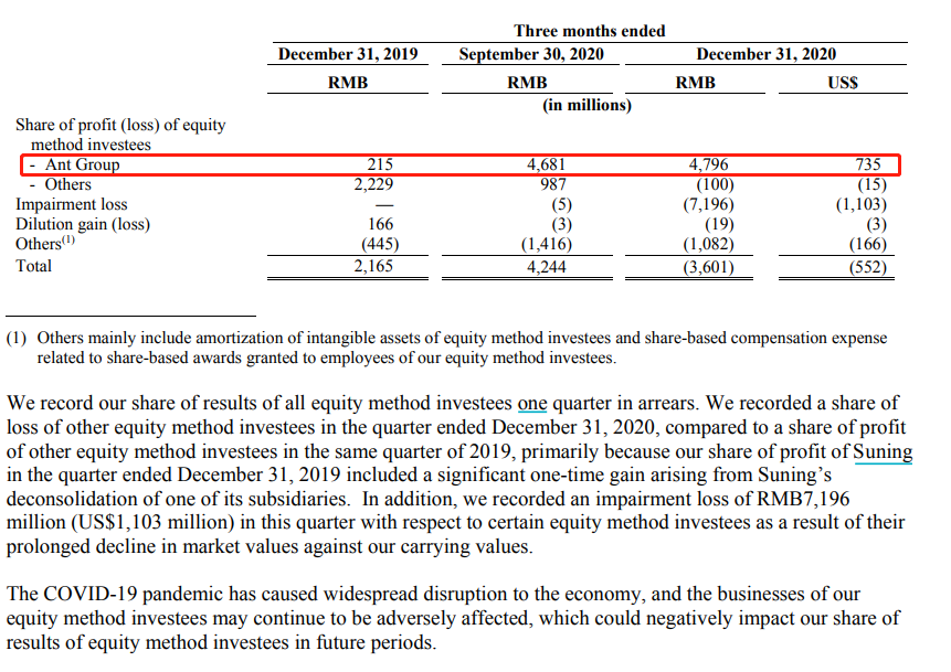 阿里巴巴财报显示,蚂蚁第三财季为该公司贡献了7.35亿美元(47.96亿元人民币)利润;上一年该项利润数额为2.15亿元。