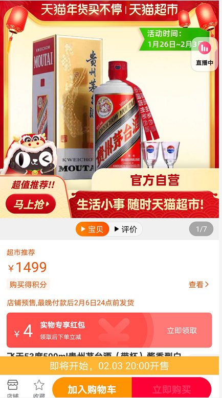 天猫超市此前抢购没有消费门槛,因此并没有相关调整。消费者可以随时加入购物车,但基本上很难买到。2月3日,天猫超市销售的飞天茅台53度500ml贵州茅台(带杯),要晚上8点才能抢购。