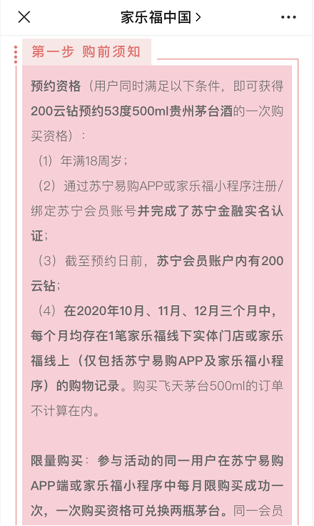 此外,记者在家乐福中国公众号上也看到了购买茅台的相关活动,“购买须知”明确,消费者预约购买茅台需满足相关的预约资格,如需绑定苏宁会员账号,账户内要有200云钻,过去三个月在家乐福月均有一笔购物记录等,有用户留言评论表示“抢了一个月都没抢到”、“连续三个月都要有购物记录,太难了”。
