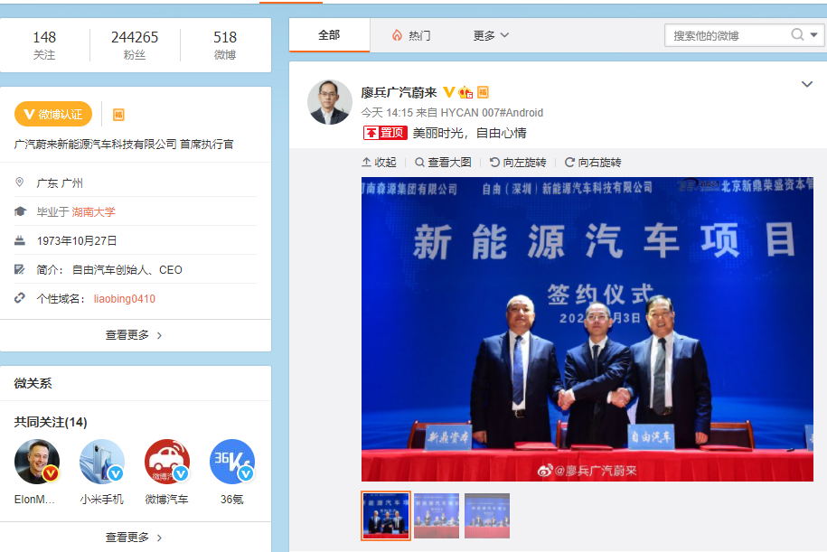 此前在1月25日,廖兵表示,已辞任广汽蔚来的CEO及其下属子公司所有职务。据悉,作为广汽蔚来的创始人兼原CEO,廖兵曾在广汽本田、广汽零部件、广汽菲克和广汽研究院任职高管。