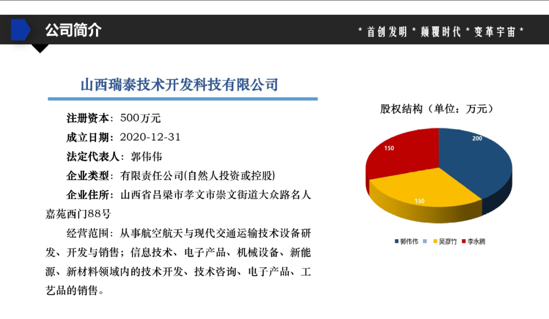 PPT显示,“时空隧道生成”项目属于一家名为山西瑞泰技术开发科技有限公司,成立于2020年12月31日,注册资本500万元,法定代表人和董事长名叫郭伟伟,项目技术保守估值5.4万亿元,目前需要融资2亿元。