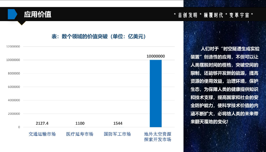 根据计划书,“时空隧道生成实验装置”的应用价值有四大市场,前三个依次为通运输市场、医疗延寿市场和国防军工市场,均在千亿美元的量级。