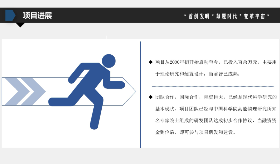 计划书透露,其团队已与中国科学院高能物理研究所达成了初步的合作协议,并称,当资金到位之后,即可参与项目研发和建设。