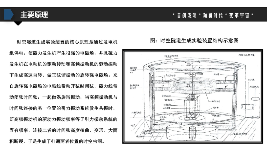 在接受《国际金融报》记者采访时,郭伟伟称,虽然“时空隧道生成”PPT是由己方委托浙江的一家融资信息服务平台“投融界”帮忙制作,不过,其中有关“时空穿梭”的内容和技术理论均源于他的著作《时空论》,这本“十万字著作”也构成了“时空隧道生成装置”的理论基础。