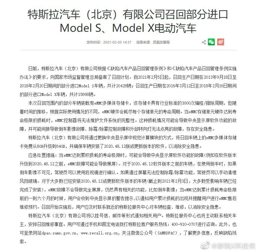 近日,特斯拉正在经历其成立以来最大规模的一次故障召回。2月2日,美国国家公路交通安全管理局(NHTSA)在网站上发布了新的召回公告。公告显示,新能源车企特斯拉已经申请“自愿”召回134951辆ModelS和ModelX汽车,理由是这些车辆上的嵌入式多媒体存储卡(eMMC)故障导致中控屏幕无法正常使用。