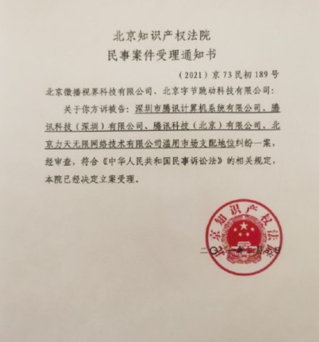 3、北京知识产权法院正式受理抖音诉腾讯垄断纠纷案