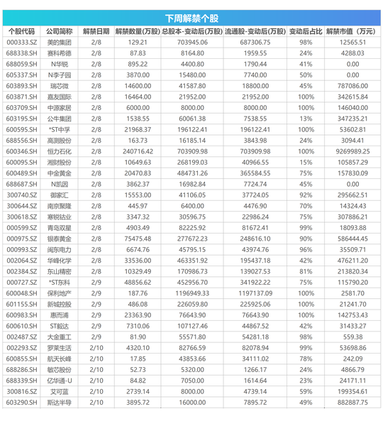 从解禁股情况来看,恒力石化解禁市值达927亿元,占下周解禁市值的6成以上。此外,斯达半导、瑞芯微、银泰黄金解禁市值超50亿元。瑞芯微、嘉友国际、中源家居、艾可蓝流通盘将增加超100%。