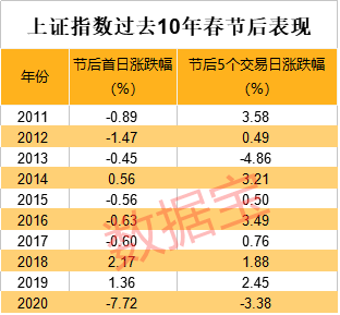 回顾近十年A股春节后市场表现可以发现,市场节后几个交易日上涨概率很高。数据宝统计显示,近十年(2011年-2020年)上证指数春节后首个交易日上涨的次数只有三次,下跌概率达七成,平均下跌幅度为1.76%。