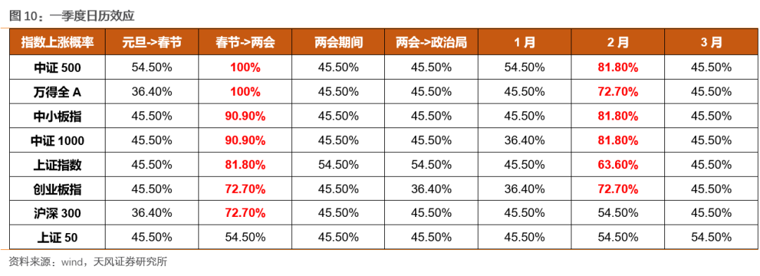 从日历效应出发,【春节后-两会前】这一阶段是一季度胜率最高区间。除上证50以外,其他主要指数上涨概率都超过70%。原因或在于,投资者出于规避春节假期间不确定性的考虑而降低的仓位,节后可能回流;同时两会前夕往往是改革、宽松政策等预期比较高涨的时期。