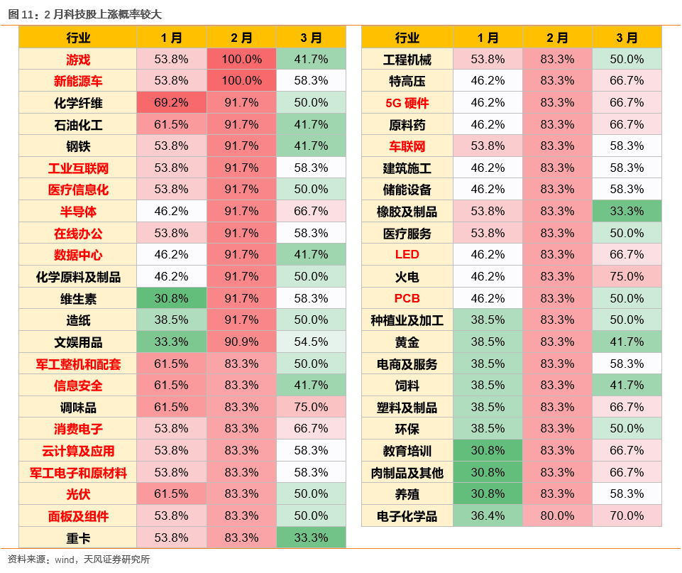 考虑到春节期间海外权益市场普涨、华为禁令的转机(虽无实质变化、但有情绪影响)以及年内首批专项债提前发放的预期等因素,今年的高胜率区间仍然值得期待。具体到行业上,历史数据表明2月胜率更高的主要是:TMT+化工子行业+机械子行业。