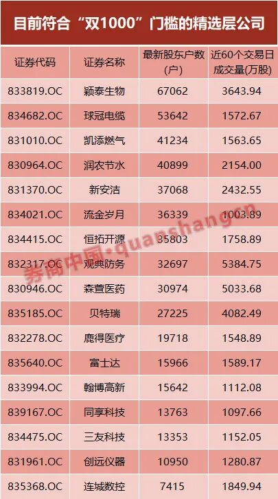 据券商中国记者统计,符合“双1000”门槛的精选层公司共有17家,分别是颖泰生物,球冠电缆、凯添燃气、润农节水、新安洁、流金岁月、恒拓开源、观典防务、森萱医药、贝特瑞等。