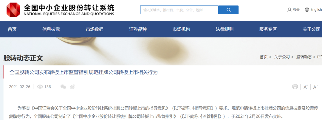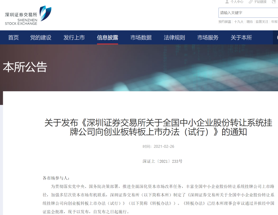 2月26日,沪深交易所和全国股转公司发布了新三板向交易所市场转板上市的规定,明确转板上市各项制度安排,规范转板上市行为。这是推进资本市场全面深化改革的重要举措,有助于丰富新三板挂牌公司上市路径,打通中小企业成长壮大的发展通道,加强多层次资本市场有机联系,增强金融服务实体经济能力。