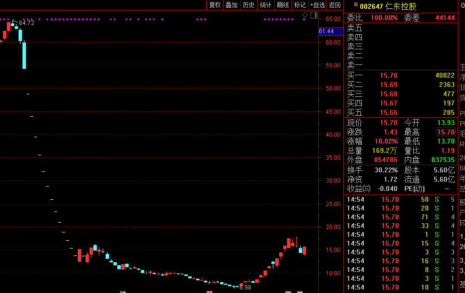 2020年11月20日,仁东控股在曝出公司资金紧张、贷款逾期后,又失去了国资托管,随后公司股价雪崩,至2020年12月14日,公司上演了14个连续跌停的惨案。创下当年连续跌停个股的纪录的仁东控股,也凭此成为了“跌停王”、“史上最强绞肉机”。