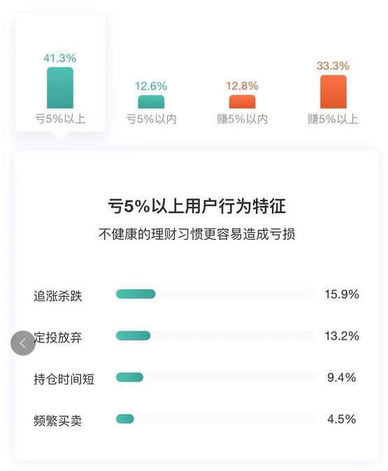 其中超80%的持有人亏损,亏5%以上的持有占了65%。而挣了5%以上的持有人,占比不到10%!数据对比悬殊得可怕。