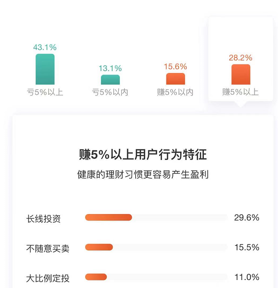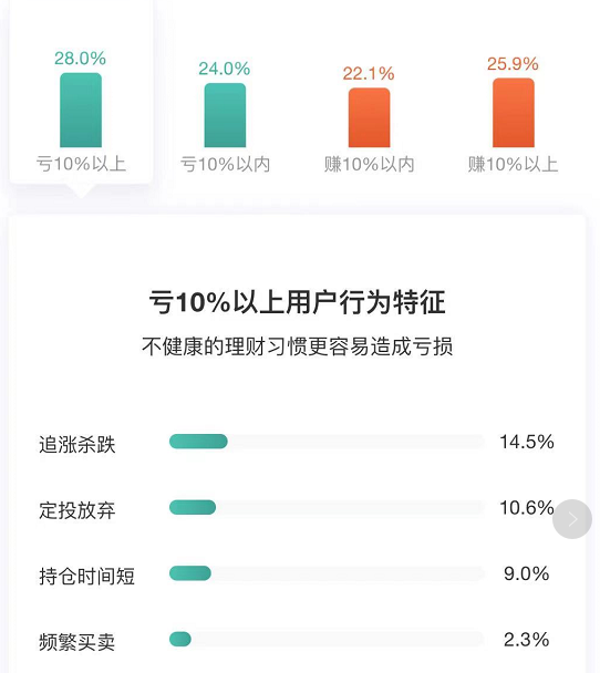 为什么半数以上的基民挣不到钱?支付宝的数据显示,有以下几种原因,排名第一的是放弃定投、而第二的原因是追涨杀跌,第三是持有时间段,第四是频繁买卖。