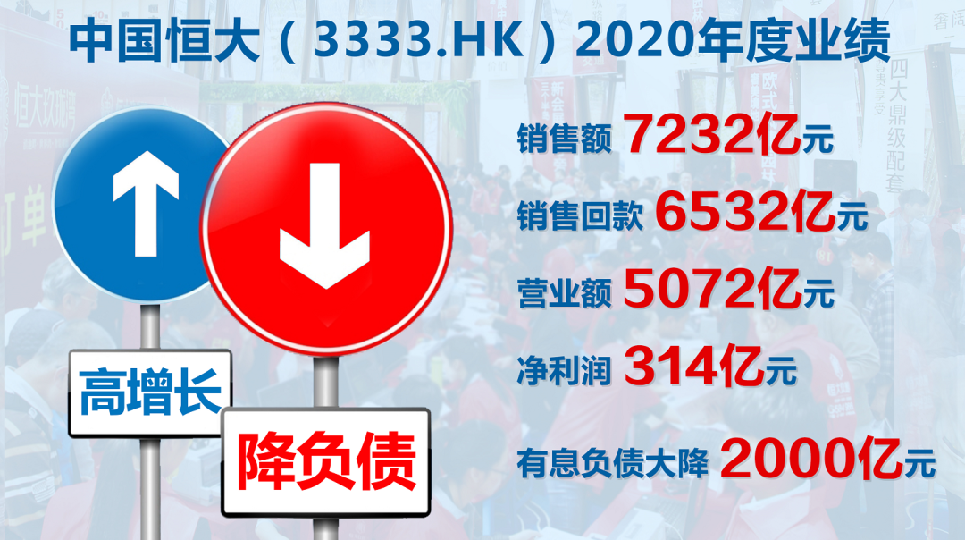 3月31日下午,中国恒大(03333.HK)发布2020年度业绩公告,全年实现销售额7232亿元,销售回款6532亿元,营业额5073亿元,净利润314亿元,各项核心指标继续位居行业前列。