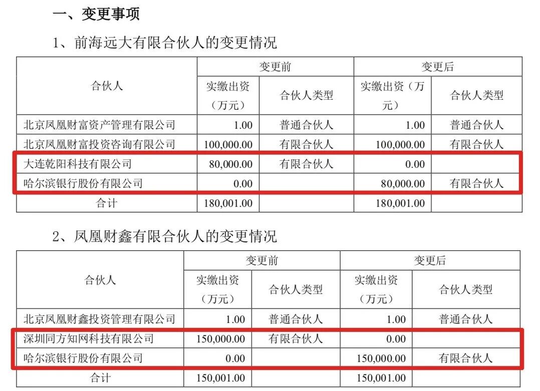 凤凰财鑫则有2名有限合伙人,哈尔滨银行受让深圳同方知网科技有限公司的全部持股(持股比例99.99%)。天眼查APP显示,该项变更4月14日已完成。