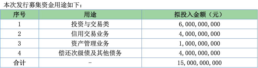 具体来看,此次募资的最大头投向了投资与交易类业务,拟投入金额约60亿元,其中拟使用不超过50亿元募集资金用于固定收益业务、10亿元用于权益类业务。
