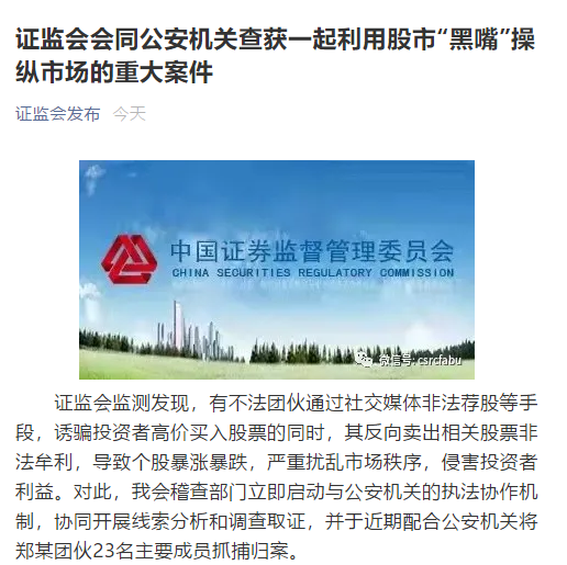 21日晚间,据证监会官方消息,证监会监测发现,有不法团伙通过社交媒体非法荐股等手段,诱骗投资者高价买入股票的同时,其反向卖出相关股票非法牟利,导致个股暴涨暴跌,严重扰乱市场秩序,侵害投资者利益。对此,我会稽查部门立即启动与公安机关的执法协作机制,协同开展线索分析和调查取证,并于近期配合公安机关将郑某团伙23名主要成员抓捕归案。