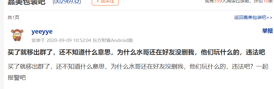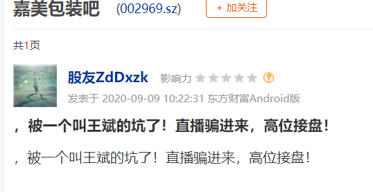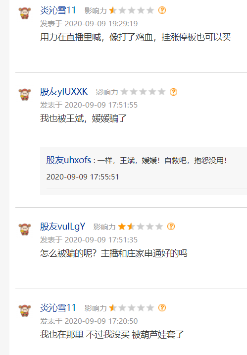 东方财富网的股吧有投资者发帖称,被湖北天门叫斌哥和媛媛的骗子组群直播骗进来,高位接盘!用力在直播里喊,像打了鸡血,挂涨停板也可以买!