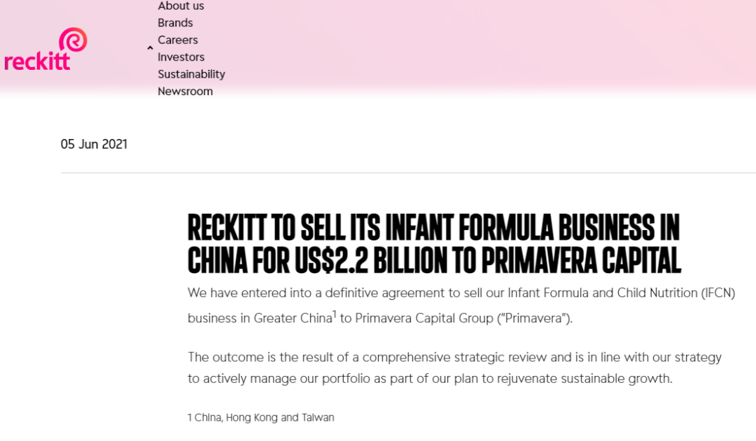 北京时间6月6日凌晨,拥有杜蕾斯、滴露等知名快消品的英国消费品巨头利洁时(Reckitt)在官网发布消息称,将以22亿美元(约合人民币140亿元)的价格将其在大中华区的婴儿配方奶粉和儿童营养品业务(相当于美赞臣中国)出售给春华资本。利洁时将继续持有美赞臣中国8%的股份。